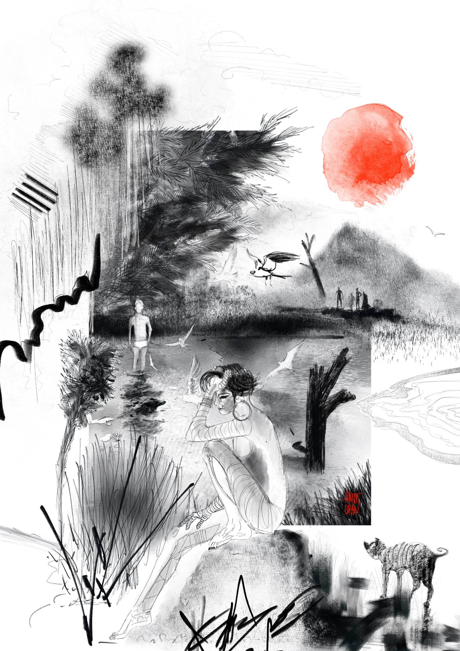 Graphite and charcoal shape the emotional architecture — raw and intimate.Bone white opens space, inviting stillness and reflection.Taupe grounds the landscape in quiet realism.The vermilion sun introduces a pulse — intensity, rupture, awakening.